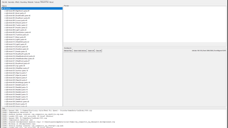 The global “Item” Buttons do what they say, depending on the selected tab, you can select geometry, effects or bounding objects and ex/import them, copy or delete them. Exporting items will create a .bin dump with a .json file of the part as sidecar to provide info on how to reimplement the dump in another CRP.